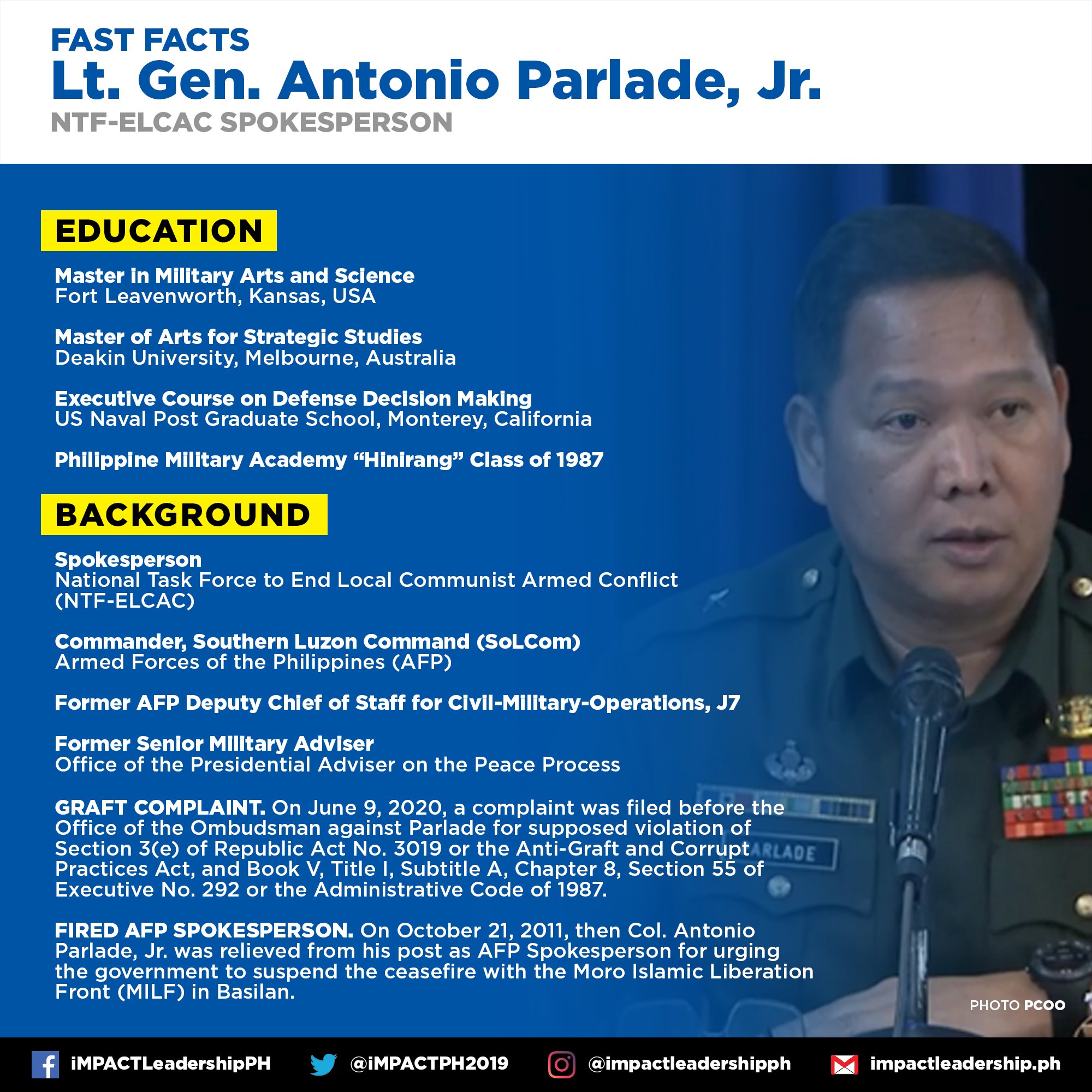 After he accused a journalist of aiding terrorists by spreading lies. the problem does not start and stop with parlade. Antonio parlade is on facebook. See more of antonio parlade on facebook. Major general antonio parlade jr told rappler he formally took over as chief of the armed forces of the philippines (afp) southern luzon command (solcom) in a ceremony at camp nakar in lucena. And actress angel locsin, the issues that cropped up these past weeks including the allegations against her and her sister angela 'ella' colmenares, were discussed.