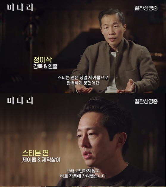» 미나리 정이삭 감독, 스티븐연 아카데미 시상식 레드카펫 도착.jpg 9. 8유노윤호 코로나19 방역수칙 위반 깊이 반성, 스스로 부끄럽고 화나. 미국에 정착해 살아갔던 이민 세대라면 국적과 인종에 상관없이 공감할 만한 보편성을 지녔다. 정이삭 감독이 연출한 '미나리'는 윤여정 외에도 한예리, 스티븐 연 등이 출연한 작품으로 에단 호크, 니콜라스 홀트 등 유명 배우들의 찬사 속에 순항 중이다. 윤여정은 이 영화에서 딸인 모니카(한예리)를 돕기 위해 한국에서 온 할머니 순자를 연기했다.